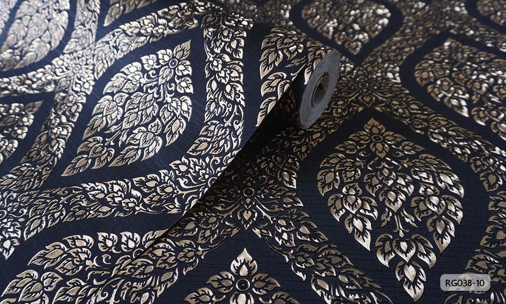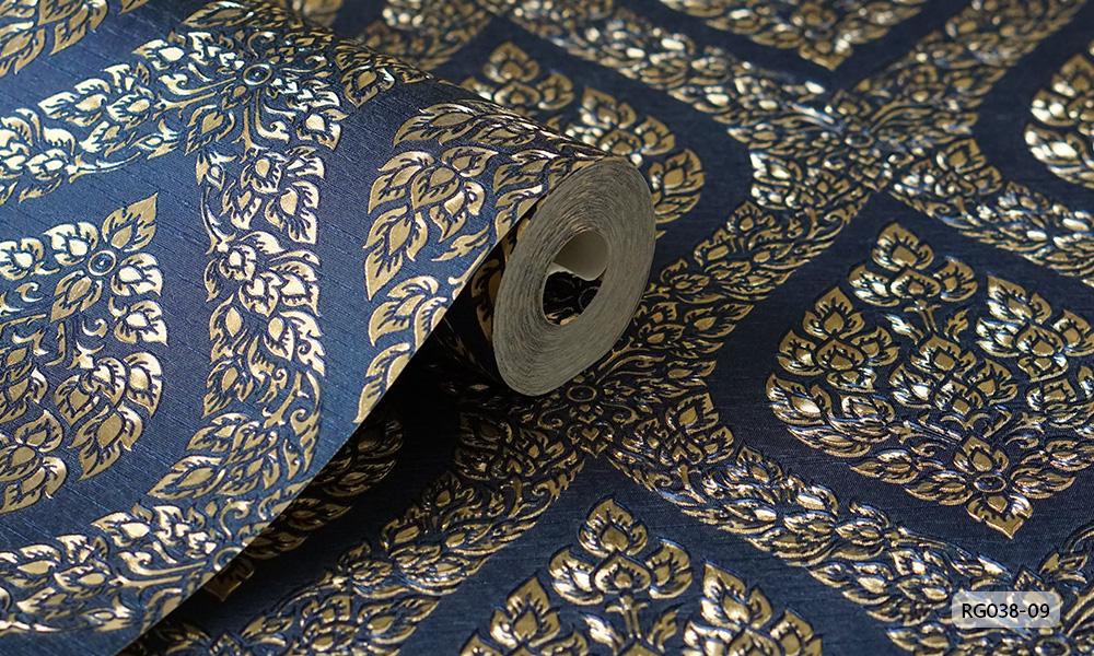 วอลเปเปอร์ติดผนังลายไทย ลายพุ่มข้าวบิณฑ์ สีทอง-พื้นน้ำเงิน (ลายนูน) RG038-09 สำหรับตกแต่งผนัง ห้องพระ, โบสถ์, ศาลาวัด, สำนักงาน, ร้านอาหาร, ร้านสปาไทย และสถานที่อื่นๆ ทีเน้นความเป็นไทย.